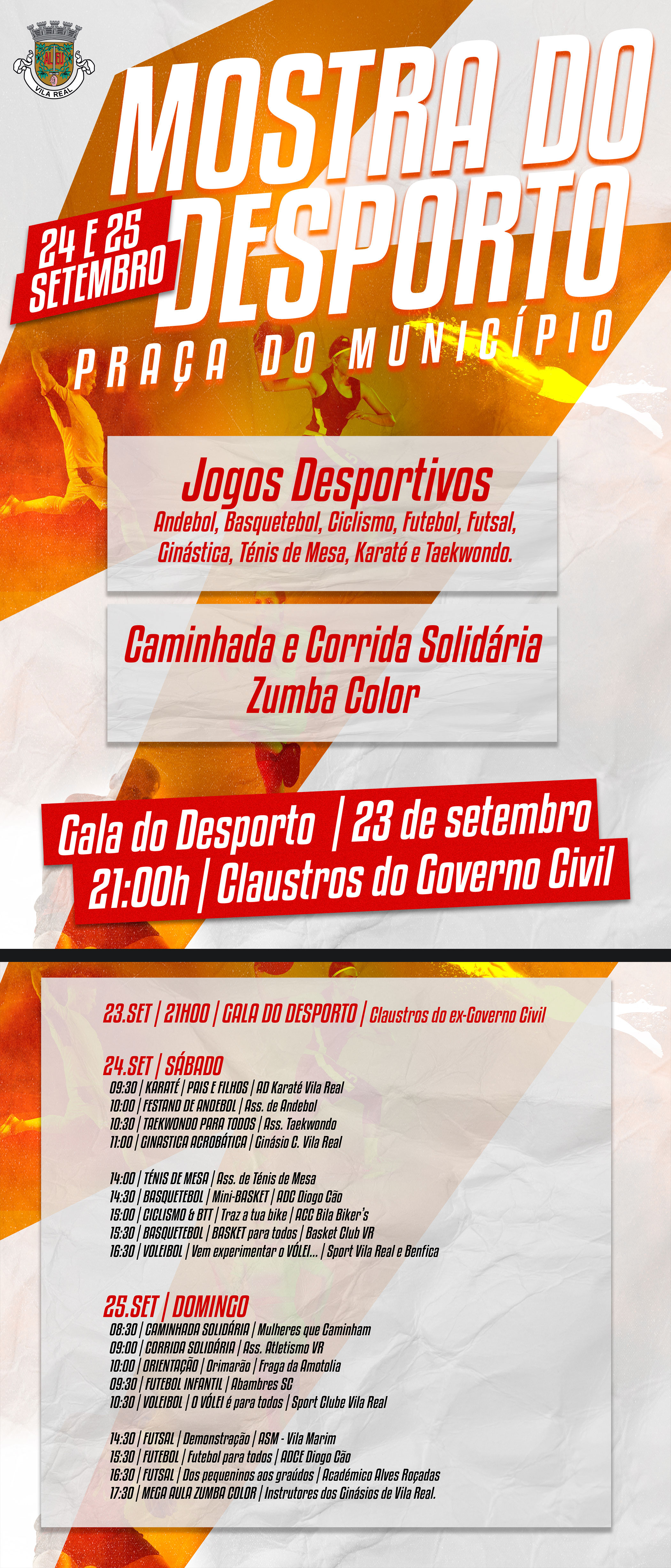 Durante estes dois dias, em plena Praça do Município, crianças, jovens e seniores terão ao seu dispor um conjunto de atividades desportivas, como o andebol, basquetebol, futebol/futsal, karaté, ciclismo, ténis de mesa e taekwondo. Estas atividades são organizadas pelas Associações de modalidade e associações/clubes desportivos do concelho. Para além da demonstração das atividades desportivas vai-se realizar, no dia 25 de setembro, domingo, no período da manhã, para todas as faixas etárias, uma Corrida e Caminhada Solidárias organizadas pelas “Mulheres que caminham” e Associação de Atletismo.